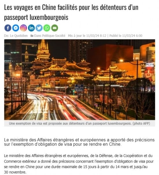 近日,中國政府決定自2024年3月14日0時(shí)起至2024年11月30日24時(shí),對(duì)包括盧森堡在內(nèi)的6國持普通護(hù)照人員實(shí)行部分免簽。中國駐盧使館及時(shí)向盧外交部等部門和主流媒體作了通報(bào),盧政府和媒體對(duì)中方免簽政策予以高度評(píng)價(jià)。