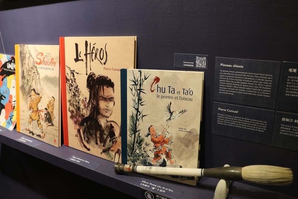 這是3月23日在“甲子情深——中法百姓故事展”上拍攝的法國(guó)畫(huà)家皮埃爾·科尼埃爾創(chuàng)作的“中國(guó)風(fēng)”法語(yǔ)繪本及其在中國(guó)訪問(wèn)期間獲贈(zèng)的毛筆。新華社記者張百慧攝