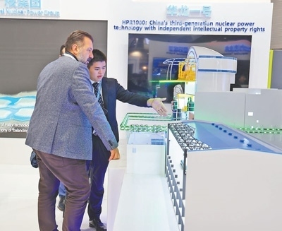 2023年11月,在法國巴黎舉行的第五屆世界核能工業(yè)博覽會上,參觀者在中國廣核集團(tuán)有限公司展臺前了解“華龍一號”核電機(jī)組模型。本報(bào)記者 尚凱元攝