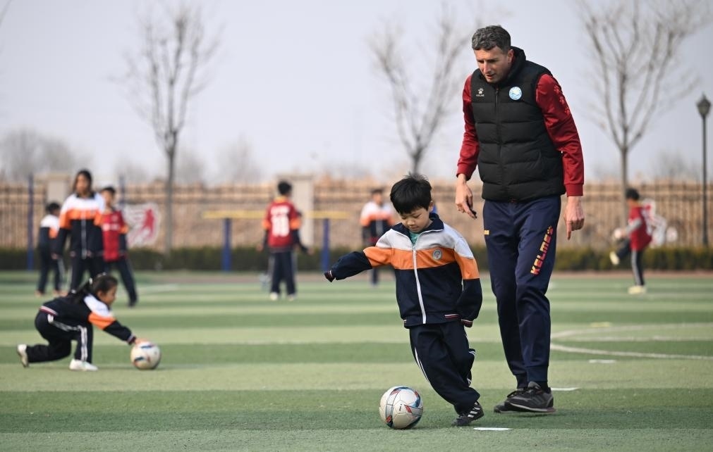 ?亞歷山大·潘蒂奇(右)在天津市靜海區(qū)華康街道第一小學(xué)指導(dǎo)小球員進(jìn)行足球盤帶(3月6日攝)。新華社記者 孫凡越 攝