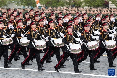 5月9日,在俄羅斯首都莫斯科,鼓手編隊走過紅場。新華社記者 白雪騏 攝