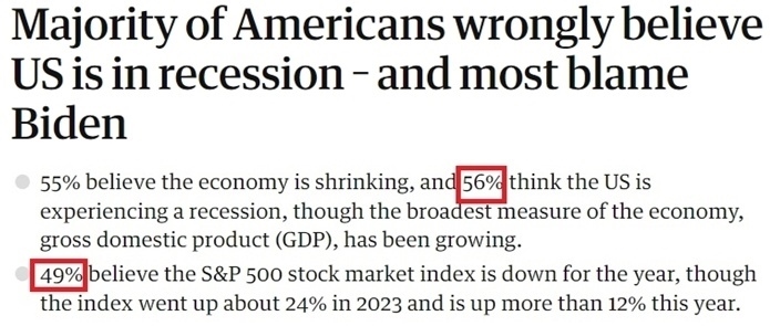 眼下美國的經(jīng)濟現(xiàn)狀,被經(jīng)濟學(xué)家們稱為“氛圍衰退”。這個詞最早由網(wǎng)紅經(jīng)濟評論員凱拉 斯坎倫創(chuàng)造,用以描述人們對經(jīng)濟狀況存在的悲觀情緒,即便是表現(xiàn)良好的經(jīng)濟統(tǒng)計數(shù)據(jù)也無法消除這種悲觀情緒。