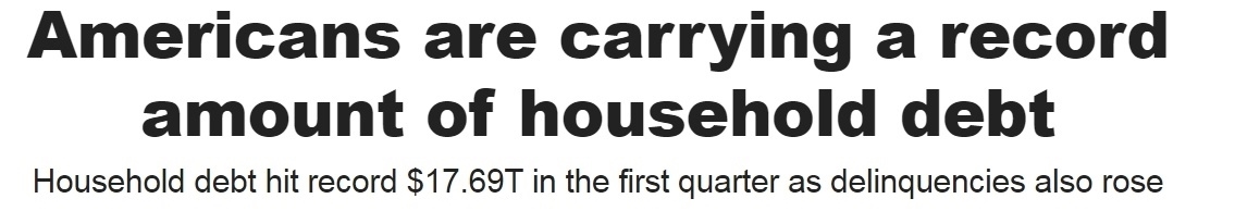 美國紐約聯(lián)邦儲備銀行公布的最新數(shù)據(jù)顯示,今年一季度,美國家庭債務(wù)總額達到17.69萬億美元(約合人民幣128萬億元),創(chuàng)下歷史新高。