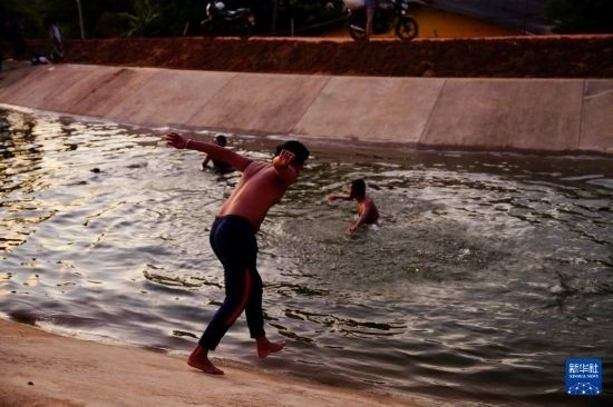 8月9日,當?shù)孛癖娫?7公里水渠中嬉戲。新華社記者 伍岳 攝