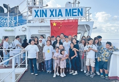 撤離人員在“新廈門(mén)號(hào)”輪上合影。外交部供圖
