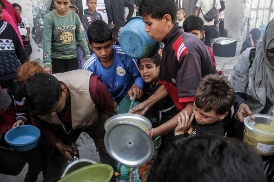 10月23日,人們在加沙地帶北部的加沙城領(lǐng)取救濟食品。新華社發(fā)(馬哈茂德·扎基攝)