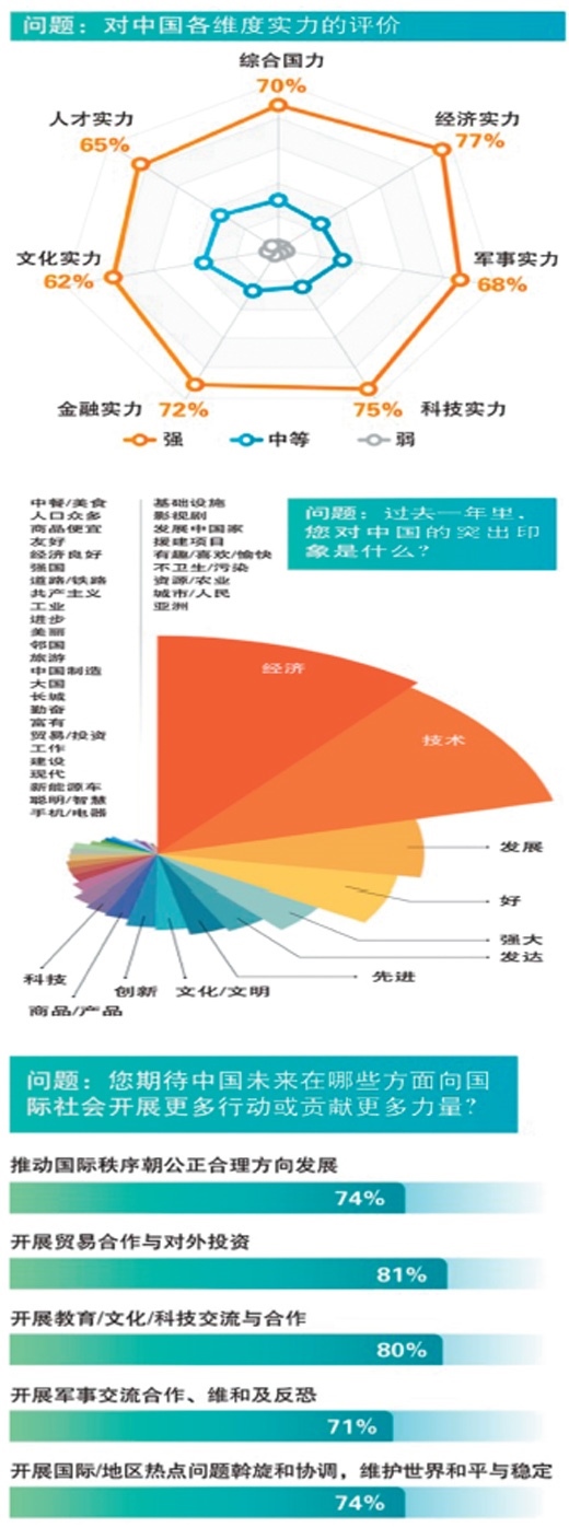調(diào)查問卷讓被訪者自主描繪其過去一年里對(duì)中國(guó)的突出印象。報(bào)告顯示,各國(guó)民眾使用率最高的關(guān)鍵詞包括“經(jīng)濟(jì)”“技術(shù)/科技”“發(fā)展/發(fā)達(dá)”“好”“強(qiáng)大/強(qiáng)國(guó)”“先進(jìn)/創(chuàng)新”“文化/文明”“商品/產(chǎn)品”“人口眾多”“中餐/美食”等。在發(fā)達(dá)國(guó)家、歐洲國(guó)家、中東國(guó)家和東盟國(guó)家,“經(jīng)濟(jì)”被提及的頻次居首;在發(fā)展中國(guó)家、非洲國(guó)家、金磚國(guó)家,“技術(shù)”被提及的頻次最高。