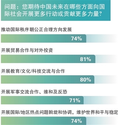近七成國(guó)外受訪民眾期待中國(guó)未來(lái)更多參與國(guó)際事務(wù)或發(fā)揮更大作用。近九成支持中國(guó)在有關(guān)國(guó)際機(jī)構(gòu)、機(jī)制或平臺(tái)中發(fā)揮更大作用。八成多期待中國(guó)在經(jīng)貿(mào)合作與教科文兩個(gè)領(lǐng)域作出更多國(guó)際貢獻(xiàn);七成多期待中國(guó)在國(guó)際秩序建設(shè)、維護(hù)和平穩(wěn)定方面發(fā)揮更大作用。國(guó)外受訪民眾對(duì)“構(gòu)建人類(lèi)命運(yùn)共同體”的認(rèn)知率達(dá)66%,對(duì)三大全球倡議和共建“一帶一路”倡議的認(rèn)知率為七成左右。對(duì)“平等有序的世界多極化”和“普惠包容的經(jīng)濟(jì)全球化”兩項(xiàng)主張,國(guó)外受訪民眾有超過(guò)半數(shù)認(rèn)同。