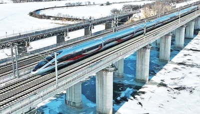 新型復(fù)興號高寒智能動車組行駛在哈齊高鐵松花江特大橋上。