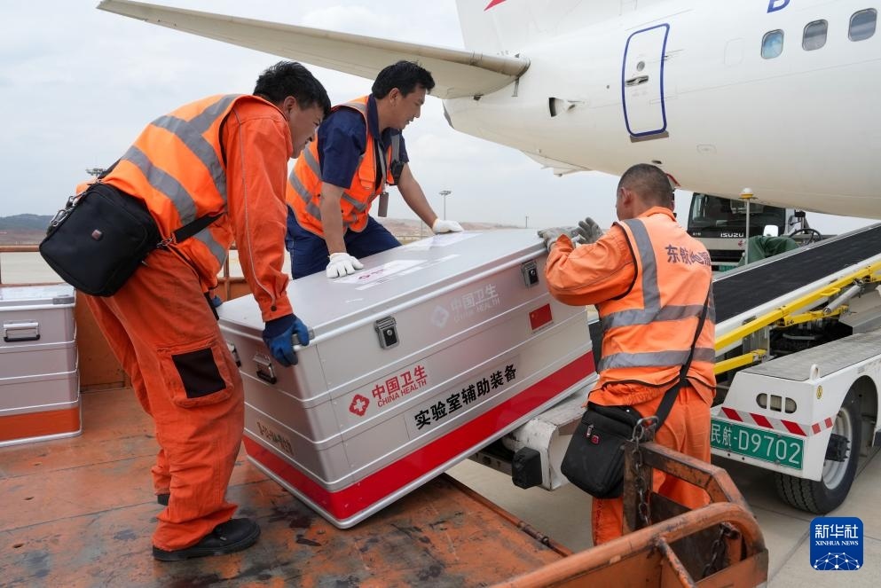 4月19日,工作人員在昆明長水機場準備將中國政府援緬衛(wèi)生防疫隊攜帶的物資裝機。新華社記者 陳欣波 攝