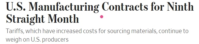 《華爾街日?qǐng)?bào)》1日發(fā)表文章稱,美國(guó)供應(yīng)管理協(xié)會(huì)(ISM)當(dāng)天公布的調(diào)查報(bào)告顯示,11月美國(guó)制造業(yè)采購(gòu)經(jīng)理人指數(shù)(PMI)已低于50的榮枯分界線。美國(guó)制造業(yè)活動(dòng)連續(xù)第九個(gè)月萎縮,而美國(guó)制造商認(rèn)為這主要是因?yàn)槊绹?guó)政府的關(guān)稅政策。