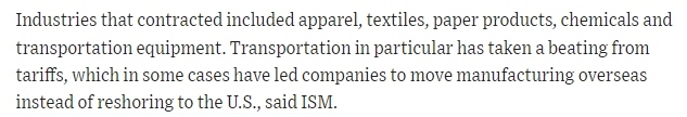 文章指出,美國(guó)制造業(yè)活動(dòng)萎縮的行業(yè)主要包括服裝、紡織品、紙制品、化工產(chǎn)品和運(yùn)輸業(yè)。文章表示,雖然當(dāng)前美國(guó)工廠產(chǎn)量有所增加,但未售出的庫(kù)存卻急劇增加。需求增長(zhǎng)放緩,這在出口市場(chǎng)體現(xiàn)尤為明顯,而受關(guān)稅影響,出口市場(chǎng)的前景更加暗淡。