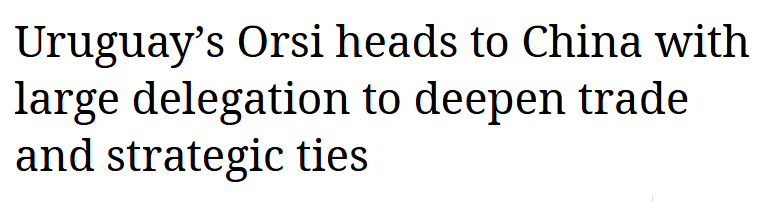 南美新聞機(jī)構(gòu)Merco Press報(bào)道稱,此次訪問正值烏拉圭與中國(guó)建交38周年,烏拉圭總統(tǒng)奧爾西率領(lǐng)約150人的代表團(tuán)啟程訪華,旨在“加強(qiáng)與烏拉圭最大貿(mào)易伙伴之間的經(jīng)濟(jì)聯(lián)系”。