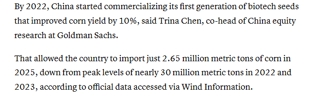 報(bào)道還稱,中國(guó)在農(nóng)業(yè)研究與開(kāi)發(fā)方面投入巨大,2019年至2021年其公共部門(mén)在這方面的支出大約是美國(guó)的兩倍。報(bào)道援引高盛中國(guó)股票研究部聯(lián)席主管的觀點(diǎn)稱,到2022年,中國(guó)已開(kāi)始將第一代生物育種產(chǎn)業(yè)化應(yīng)用,這些種子使玉米產(chǎn)量提高了10%。報(bào)道還援引萬(wàn)得資訊獲得的官方數(shù)據(jù)稱,這使得中國(guó)在2025年的玉米進(jìn)口量?jī)H為265萬(wàn)噸,遠(yuǎn)低于2022年和2023年近3000萬(wàn)噸的峰值水平。