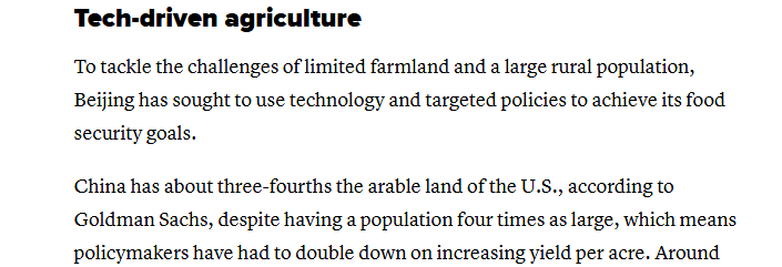 美國(guó)消費(fèi)者新聞與商業(yè)頻道援引高盛集團(tuán)的數(shù)據(jù)報(bào)道稱,中國(guó)擁有的耕地面積約為美國(guó)的四分之三,但人口是美國(guó)的四倍之多,這意味著中國(guó)的政策制定者必須加倍努力提高每畝土地的產(chǎn)量。