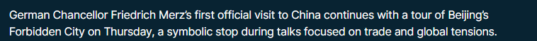 歐洲新聞電視臺(tái)26日?qǐng)?bào)道稱,在經(jīng)濟(jì)緊張局勢加劇的背景下,德國正努力尋求更平衡的貿(mào)易關(guān)系。默茨此次訪問期間的一個(gè)具有象征意義的環(huán)節(jié)就是參觀故宮。報(bào)道稱,默茨表示,德國乃至歐洲希望與中國建立一種平衡且可靠的伙伴關(guān)系。