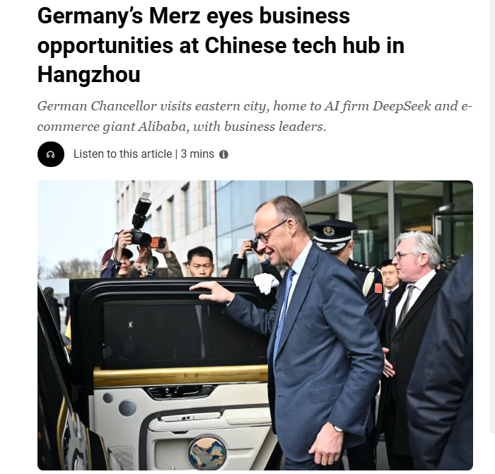 法國24新聞臺(tái)還關(guān)注了默茨在杭州的行程。報(bào)道稱,杭州聚集了多家中國大型科技公司,默茨參觀了中國的人形機(jī)器人企業(yè)。