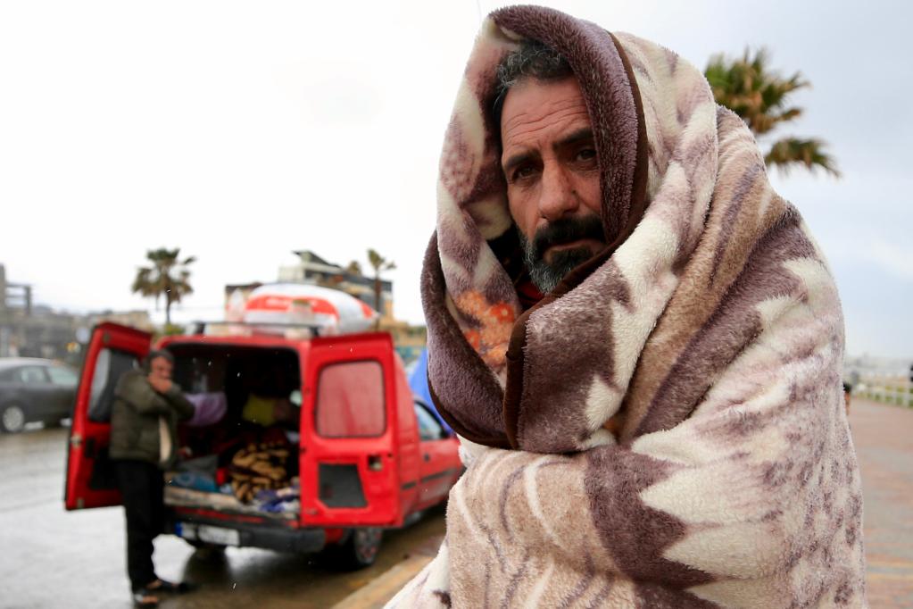 3月15日,在黎巴嫩南部賽達市附近的一條公路旁,一名黎巴嫩流離失所者用毯子御寒。新華社發(fā)(阿里·哈希紹攝)