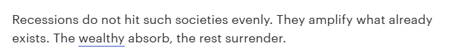 文章指出,經(jīng)濟(jì)衰退從來(lái)不會(huì)公平地影響整個(gè)社會(huì)。它只會(huì)加劇現(xiàn)有的社會(huì)分化:富人能夠化解危機(jī),而窮人只能舉手投降。