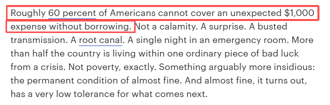 文章介紹,約60%的美國(guó)人若遭遇1000美元的意外開支,就不得不舉債應(yīng)對(duì)。不是天災(zāi),只是尋常意外,比如變速箱損壞、牙齒根管治療、急診室留觀一晚等等。美國(guó)超半數(shù)國(guó)民距離經(jīng)濟(jì)危機(jī),只差一次厄運(yùn)的降臨。這算不上真正的貧困,卻是一種更隱蔽的困境——永遠(yuǎn)在溫飽線上掙扎。而現(xiàn)實(shí)證明,這種處境根本經(jīng)不起任何風(fēng)吹草動(dòng)。