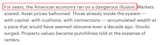 文章分析指出,美國(guó)經(jīng)濟(jì)多年來(lái)一直建立在危險(xiǎn)的幻覺之上。市場(chǎng)呈現(xiàn)虛假繁榮,資產(chǎn)價(jià)格不斷膨脹。那些掌握資本和人脈資源的既得利益者,正以驚人的速度積累財(cái)富。與此同時(shí),普通民眾卻要面對(duì)生活成本的持續(xù)攀升:食品價(jià)格從緩慢上漲到快速飆升,房租成為每月必須面對(duì)的生存考驗(yàn),信用卡從救急工具變成了新的債務(wù)陷阱。美國(guó)中產(chǎn)階級(jí)正面臨前所未有的生存壓力,階層滑落的風(fēng)險(xiǎn)遠(yuǎn)大于上升機(jī)會(huì)。