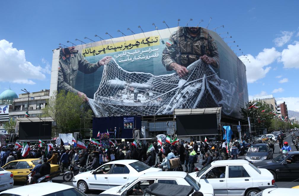 4月8日,民眾在伊朗首都德黑蘭革命廣場參加集會。廣場的大幅宣傳畫上描繪著伊朗武裝人員的形象,文字內(nèi)容是“霍爾木茲海峽仍然關(guān)閉 整個波斯灣都是我們的獵場”。新華社記者沙達(dá)提攝
