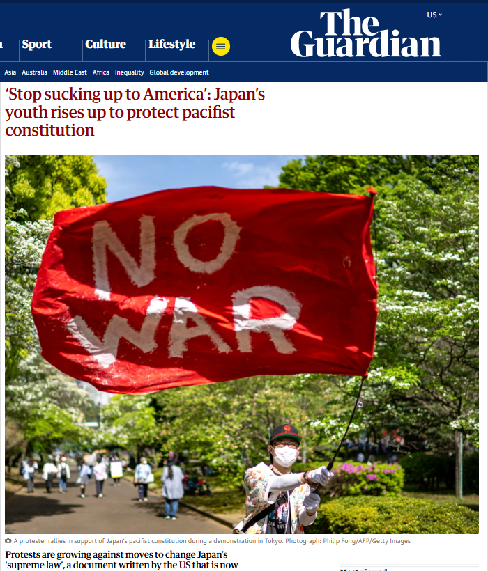 日本首相高市早苗關(guān)于修憲的相關(guān)表態(tài)引發(fā)廣泛質(zhì)疑和反對。英國《衛(wèi)報(bào)》刊發(fā)題為《“停止對美國阿諛奉承”:日本青年奮起捍衛(wèi)和平憲法》的文章,文中稱,反對修改日本和平憲法的抗議活動日益高漲,越來越多日本年輕人正成為這場反對修憲運(yùn)動的中堅(jiān)力量。
