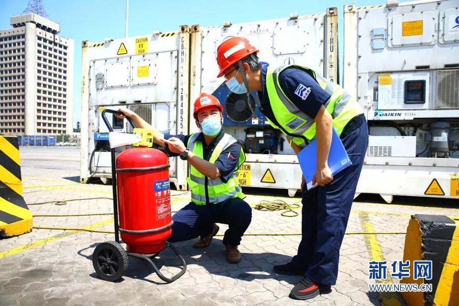 烈日當空,天津港集裝箱碼頭公司安全員正在冷箱堆存場地檢查安全消防設施。新華網(wǎng)發(fā)