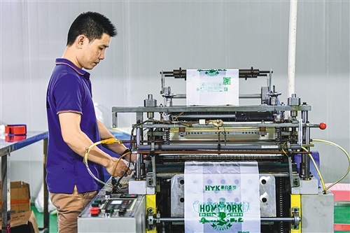 工作人員在海南海口誠佳美塑料包裝有限公司車間生產全生物降解袋(2020年11月4日拍攝)。新華社記者蒲曉旭攝