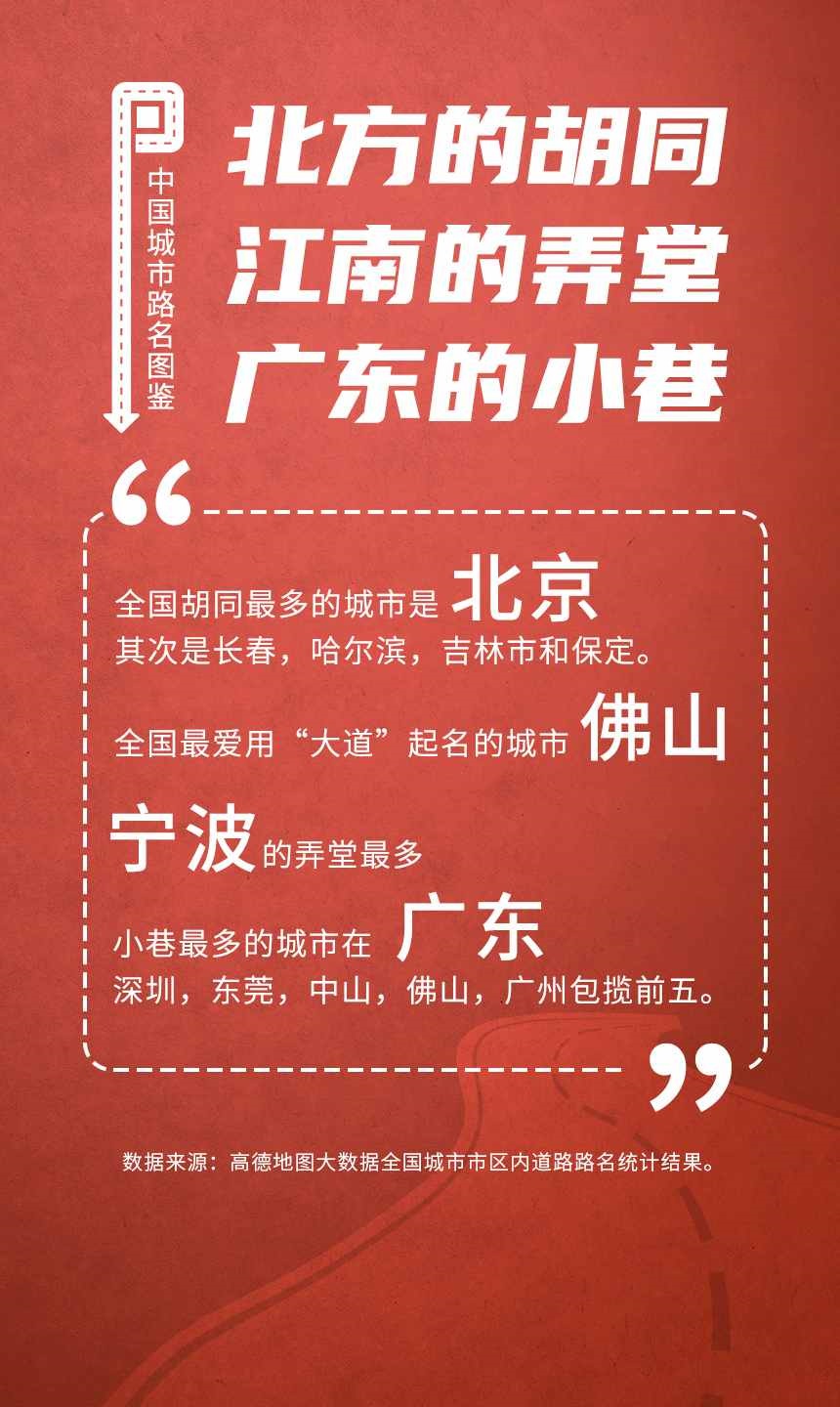 榜單顯示,人民路和建設(shè)路是全國(guó)重名率最高的道路,均有129個(gè)城市采用。此外,全國(guó)胡同最多的城市是北京;弄堂最多的城市是寧波;“小巷”最多的城市都在廣東省,深圳、東莞、中山、佛山和廣州包攬前五;“大道”最多的城市是佛山。