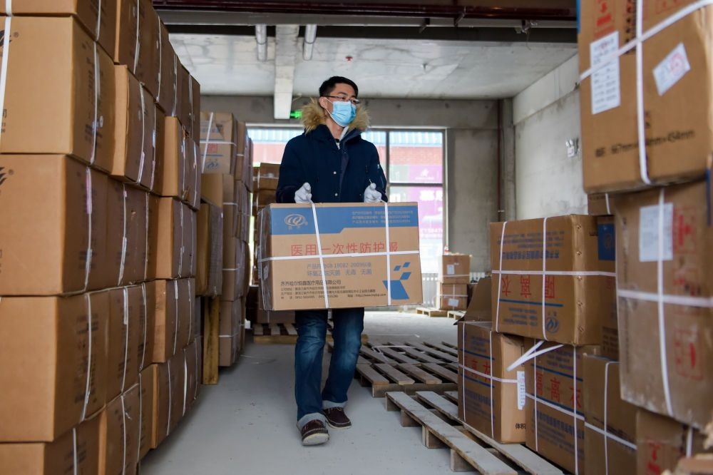 在位于滿洲里市臚臏社區(qū)的臨時物資存放點(diǎn),工作人員在搬運(yùn)防疫物資。新華社記者 李志鵬 攝