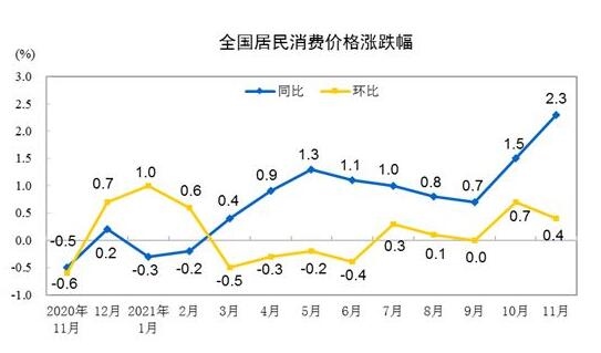 據(jù)國家統(tǒng)計局網(wǎng)站消息,2021年11月份,全國居民消費價格同比上漲2.3%。其中,城市上漲2.4%,農(nóng)村上漲2.2%;食品價格上漲1.6%,非食品價格上漲2.5%;消費品價格上漲2.9%,服務價格上漲1.5%。1—11月平均,全國居民消費價格比上年同期上漲0.9%。