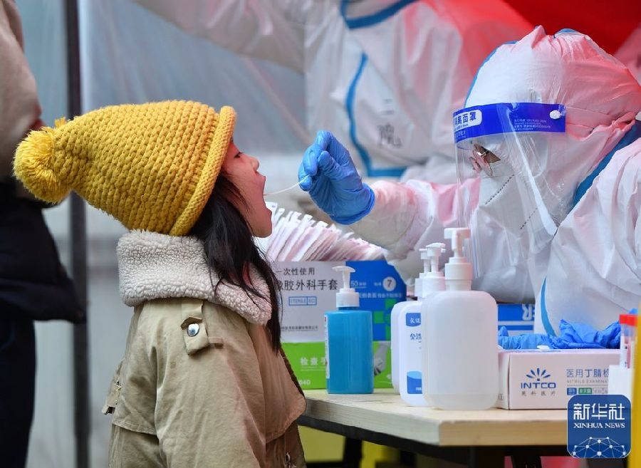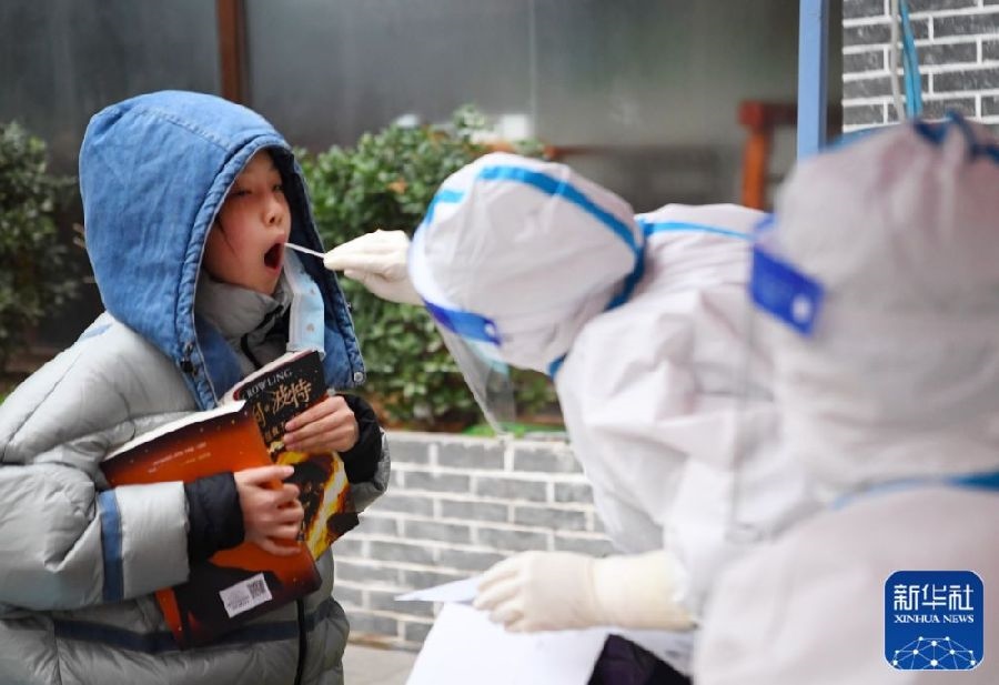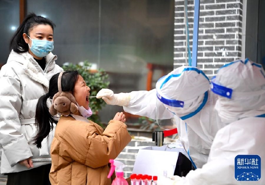 1月10日,在鄭州市二七區(qū)政通路一處核酸檢測點,醫(yī)務(wù)人員為小朋友進行核酸檢測取樣。新華社發(fā)(丁友明攝)