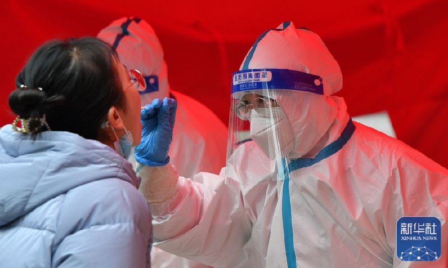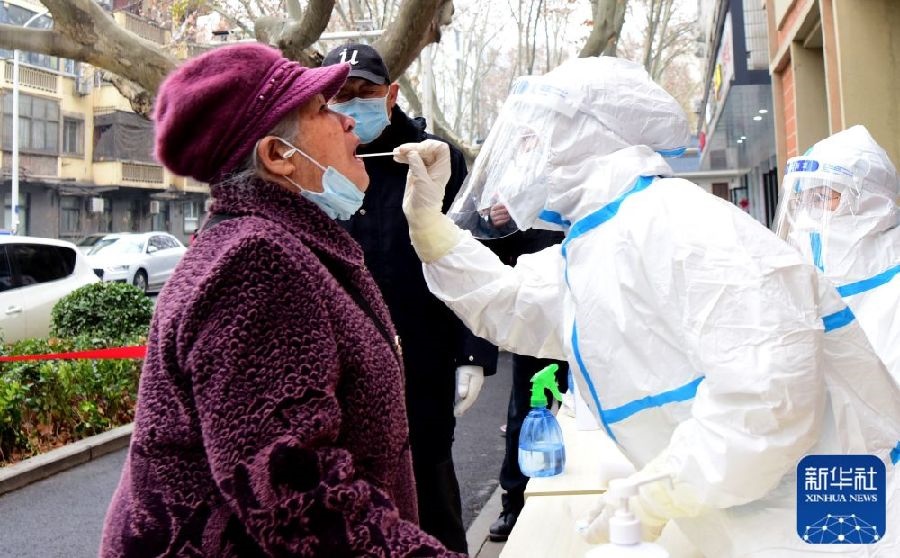 1月10日,在鄭州市二七區(qū)政通路一處核酸檢測點,醫(yī)務(wù)人員為市民進行核酸檢測取樣。新華社發(fā)(丁友明攝)