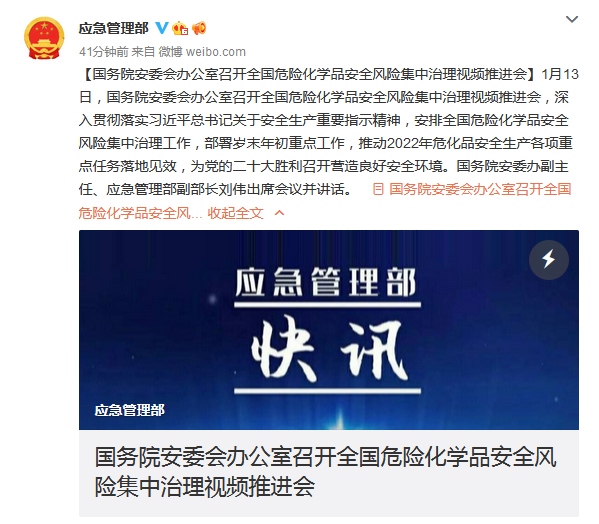 1月13日,國務(wù)院安委會(huì)辦公室召開全國危險(xiǎn)化學(xué)品安全風(fēng)險(xiǎn)集中治理視頻推進(jìn)會(huì),安排全國危險(xiǎn)化學(xué)品安全風(fēng)險(xiǎn)集中治理工作,部署歲末年初重點(diǎn)工作,推動(dòng)2022年危化品安全生產(chǎn)各項(xiàng)重點(diǎn)任務(wù)落地見效,為黨的二十大勝利召開營(yíng)造良好安全環(huán)境。