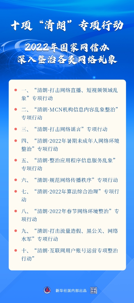 新華社北京3月17日電(記者王思北)記者17日從國(guó)新辦舉行的新聞發(fā)布會(huì)獲悉,2022年“清朗”系列專項(xiàng)行動(dòng)將重點(diǎn)開展打擊網(wǎng)絡(luò)謠言,打擊網(wǎng)絡(luò)直播、短視頻領(lǐng)域亂象,算法綜合治理,暑期未成年人網(wǎng)絡(luò)環(huán)境整治等十方面任務(wù)。