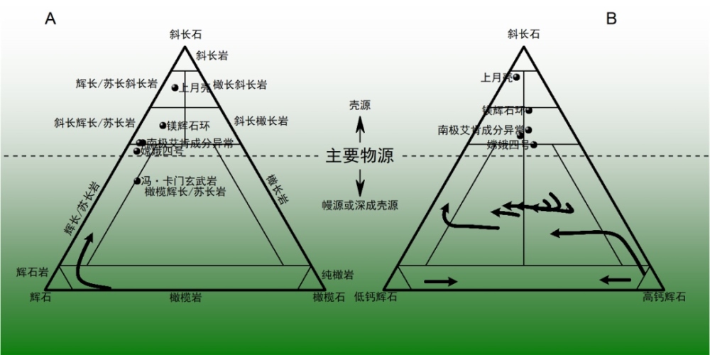 以往對(duì)南極-艾肯盆地物質(zhì)成分的研究大多只注重鎂鐵質(zhì)礦物,由于這一地區(qū)的鎂鐵質(zhì)異常特征,甚至引發(fā)了有關(guān)月幔是橄欖巖還是輝石巖的爭(zhēng)論。雖然根據(jù)月球巖漿洋假說,橄欖石和輝石是月幔的主要礦物,但是月殼形成之后的深成巖漿侵入作用同樣能夠在月殼中形成富集橄欖石或輝石的巖石,因此富集橄欖石或輝石并不能作為源自月幔的證據(jù)。迄今人類還沒有獲取南極-艾肯盆地的樣品返回地球,無法獲知其微量元素和同位素特征,通過遙感或原位探測(cè)可獲得的物質(zhì)成分信息中,斜長(zhǎng)石含量也是區(qū)分殼源和幔源巖石的關(guān)鍵指標(biāo)。