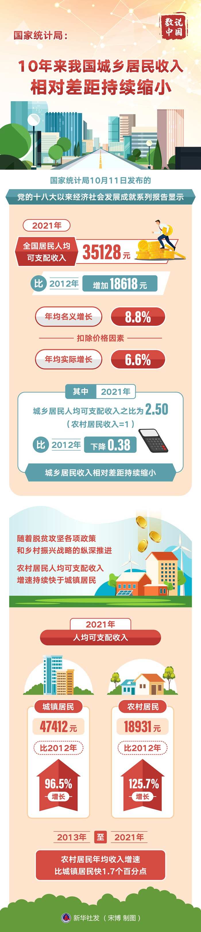 新華社北京10月11日電(記者魏玉坤、嚴(yán)賦憬)國家統(tǒng)計局11日發(fā)布的黨的十八大以來經(jīng)濟社會發(fā)展成就系列報告顯示,2021年全國居民人均可支配收入35128元,比2012年增加18618元,年均名義增長8.8%,扣除價格因素,年均實際增長6.6%。其中,2021年城鄉(xiāng)居民人均可支配收入之比為2.50(農(nóng)村居民收入=1),比2012年下降0.38,城鄉(xiāng)居民收入相對差距持續(xù)縮小。