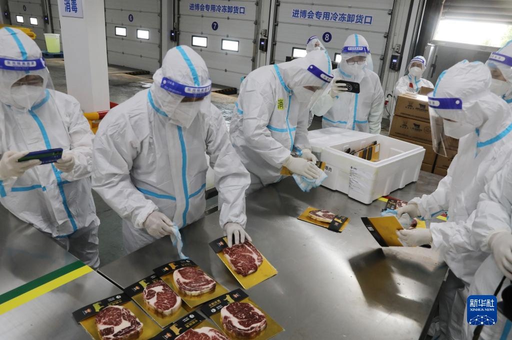 記者在現(xiàn)場看到,當運輸進口冷鏈食品展品的車輛到達后,工作人員馬上對司機進行健康碼核驗和體溫檢測,并對車輛進行消毒。裝卸過程中,司機實行“非必要不下車”。貨物入庫時,在完成外包裝消毒后,工作人員將展品拆除外包裝,對內里的小包裝進行消毒、核酸檢測,再重新裝箱、貼標簽、放入暫存庫,之后再轉入合格儲存庫。