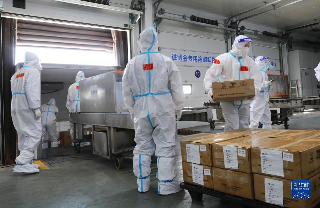 10月20日,工作人員在總倉內搬運完成卸車消毒的冷鏈食品展品。新華社記者 方喆攝