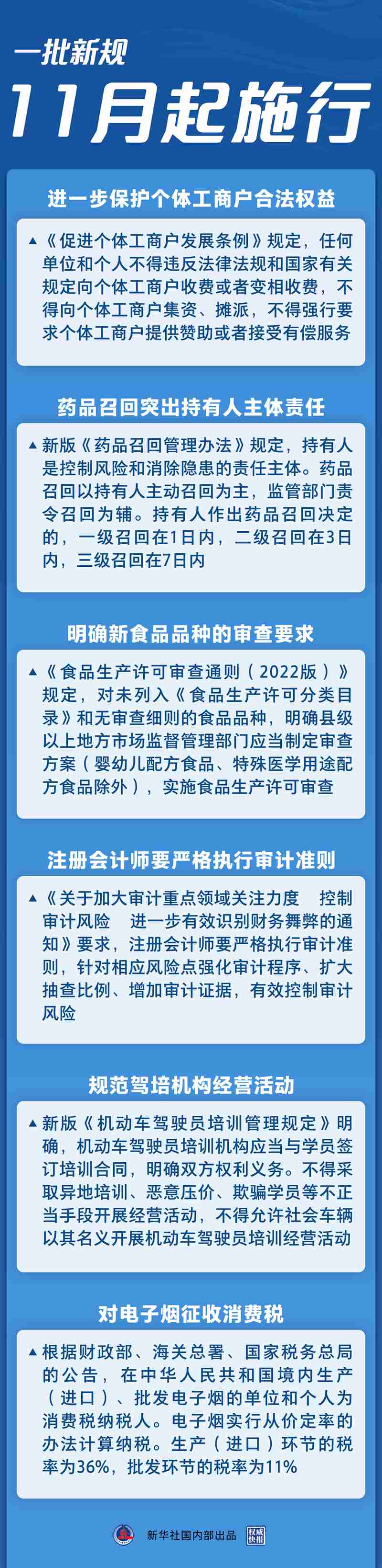這個11月,一批民生新規(guī)開始施行,影響社會生活諸多方面。保護(hù)個體工商戶合法權(quán)益、規(guī)范駕培機(jī)構(gòu)經(jīng)營活動、完善藥品召回分級制度……更完善的法治,讓你我更有獲得感。