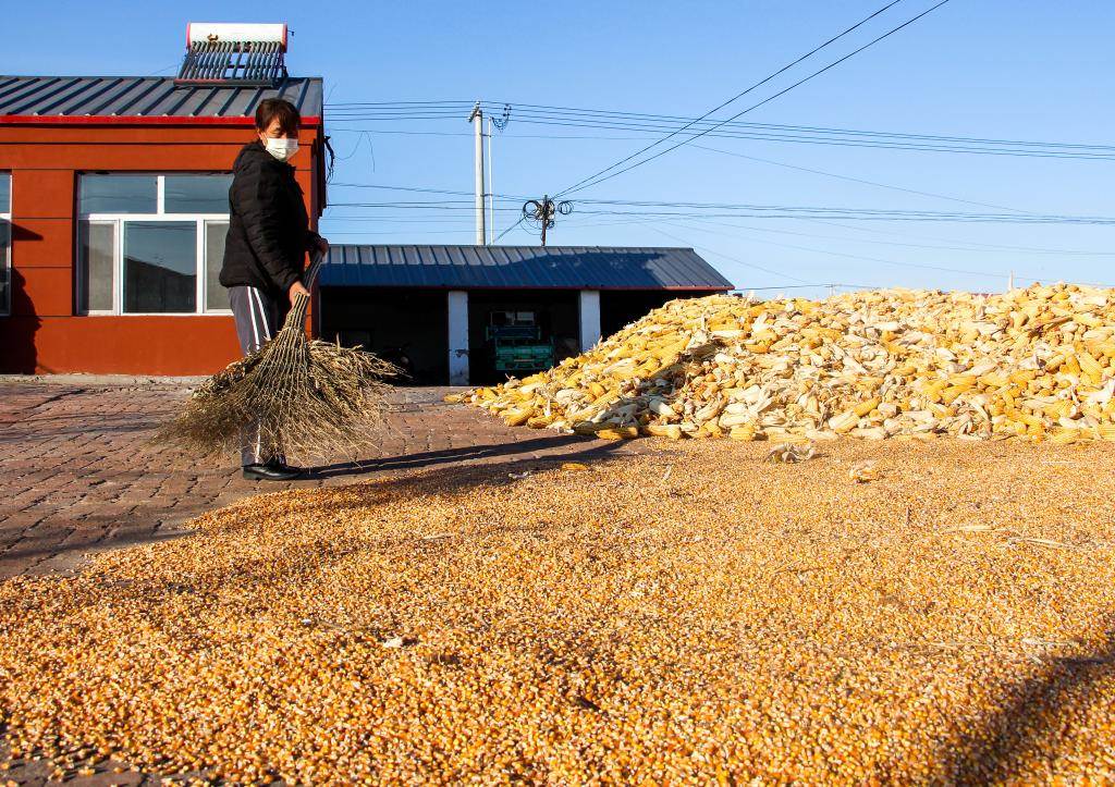 11月3日,在內(nèi)蒙古自治區(qū)通遼市開魯縣開魯鎮(zhèn)飛機場村,一名村民在院中晾曬玉米。 新華社記者連振 攝