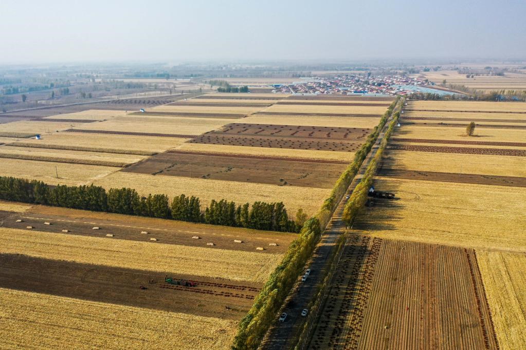 10月25日,在內(nèi)蒙古自治區(qū)通遼市開魯縣東風鎮(zhèn),一些地塊上的玉米和紅干椒已經(jīng)收割結束。(無人機照片)新華社記者連振 攝