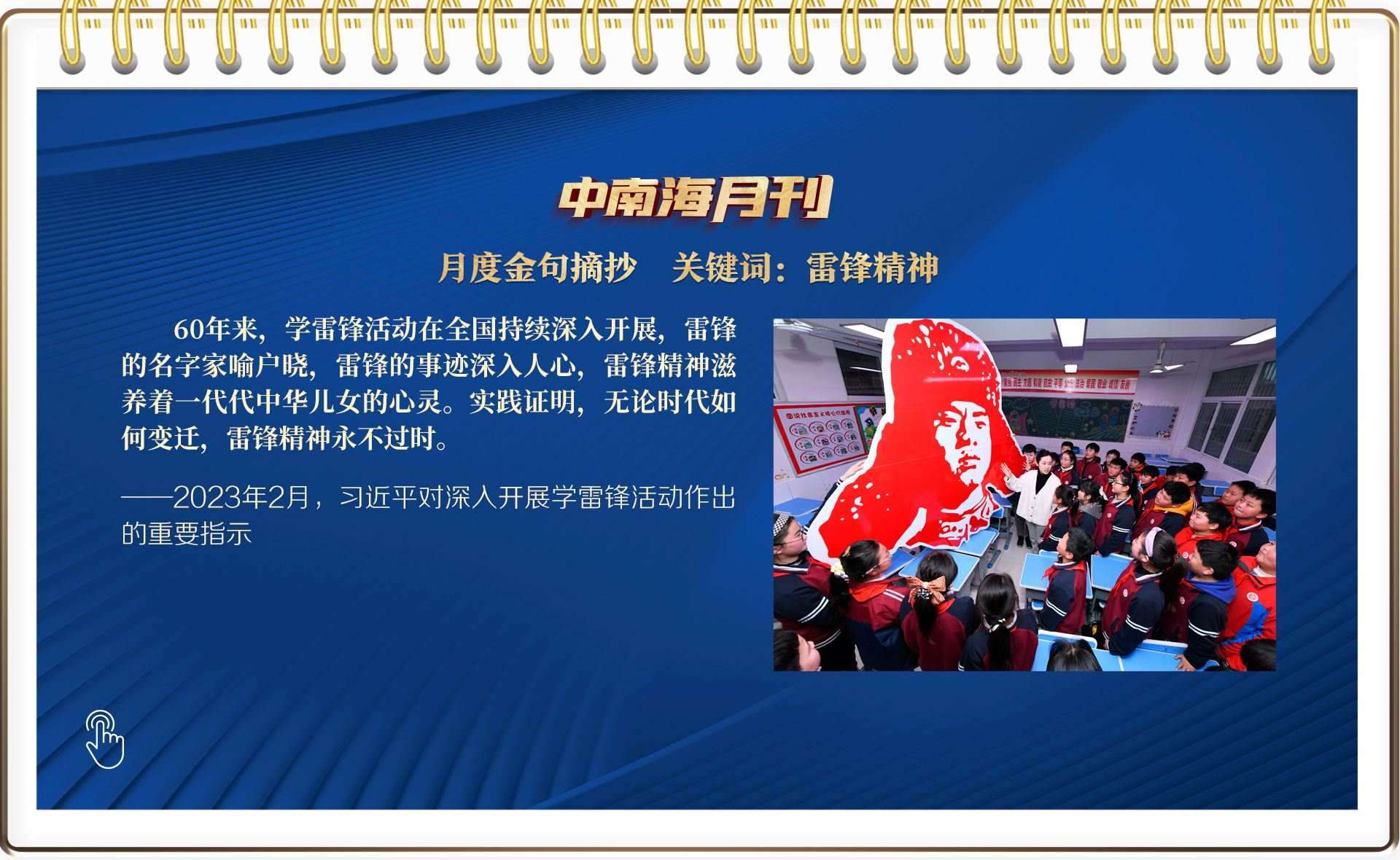 2月“關(guān)聯(lián)人物”中,雷鋒的名字家喻戶曉。在毛澤東等老一輩革命家為雷鋒同志題詞60周年之際,習(xí)近平總書記作出重要指示,一語道出了雷鋒精神的歷史厚度:“實踐證明,無論時代如何變遷,雷鋒精神永不過時。”
