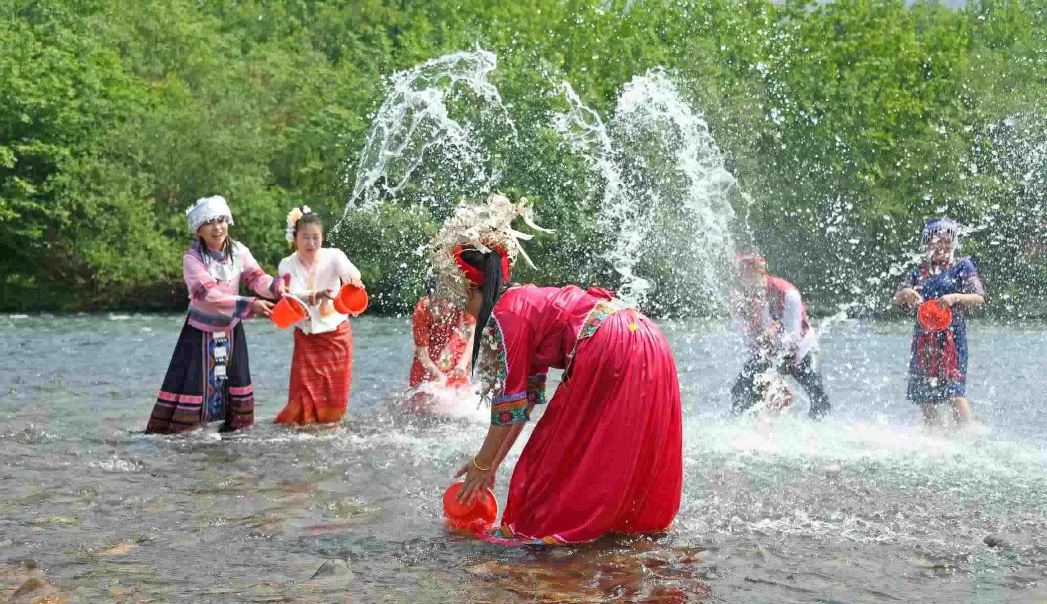 2023年4月12日,浙江臺(tái)州,仙居縣永安溪畔,傣族同胞正在參加潑水狂歡活動(dòng)。視覺(jué)中國(guó)
