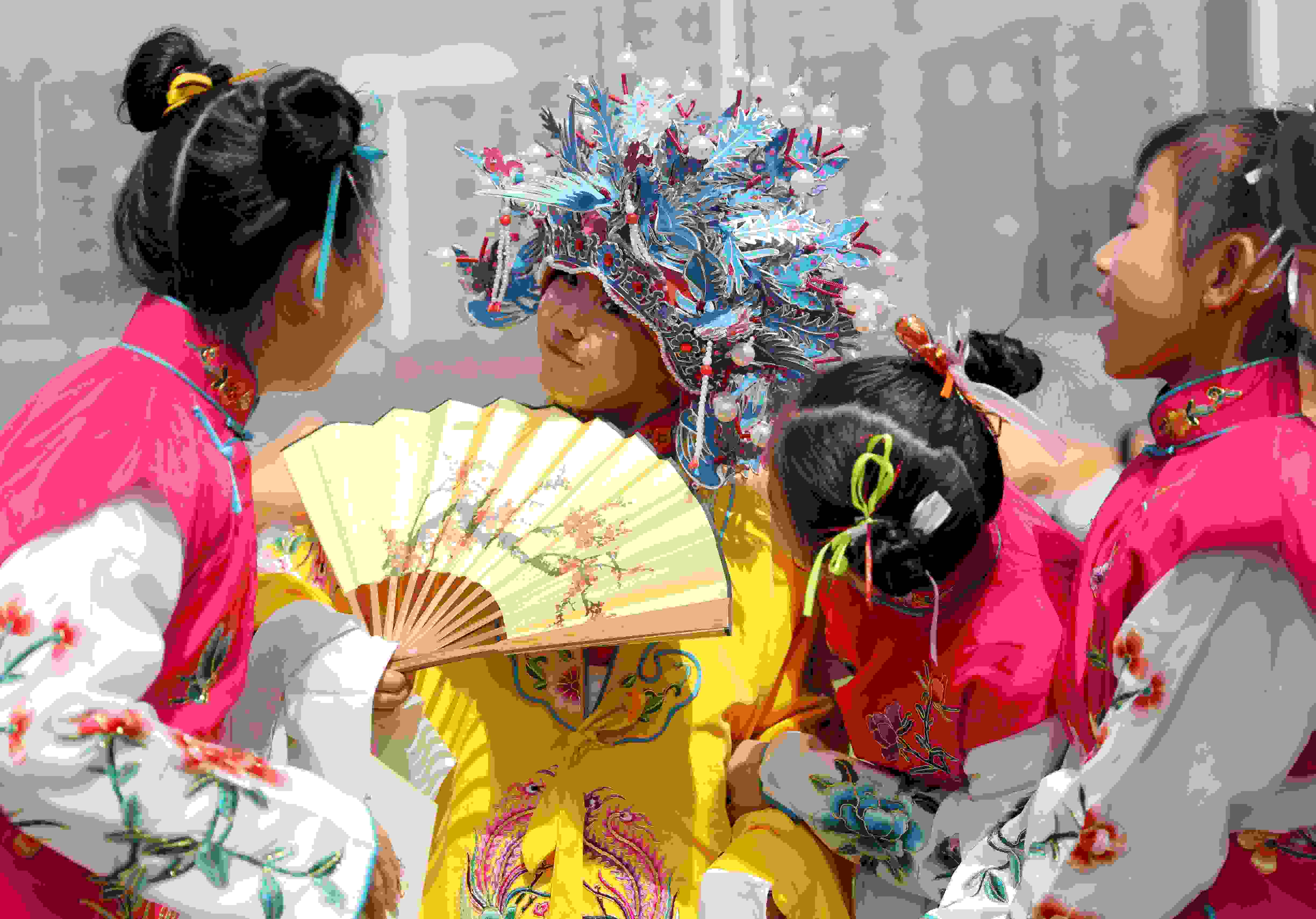4月15日,山東青島,中國(guó)石油大學(xué)(華東)韻遠(yuǎn)京劇隊(duì)的同學(xué)們聯(lián)合青島西海岸新區(qū)珠江路小學(xué)的小學(xué)生們?cè)诖髮W(xué)校園里上演了一堂生動(dòng)的戲曲普及課。
