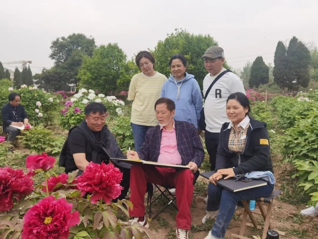 自1975年29歲的何水法先生以赤子之心,首次只身赴菏澤,48年來,為畫牡丹,寫其牡丹之真情、寫其牡丹之風(fēng)骨,寫其國花繁榮富強(qiáng)之真諦。用何水法先生世紀(jì)之初所言:“寫生是畫家與生活的對話”。藝術(shù)家也要不斷地站在時代的前列,站在歷史的高位,不斷思索,不斷地刷新繪畫語言。要緊隨時代發(fā)展的需要,不斷突破新題材、突破新意境。因此他今年又親率眾學(xué)生第十五次來菏澤深入考察,發(fā)揮示范引領(lǐng)作用,體驗(yàn)生活、開闊思維,為謳歌人民、謳歌新時代,進(jìn)行新的藝術(shù)創(chuàng)造。