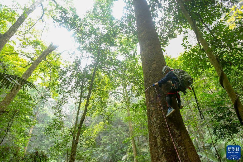 3月15日,南寧藍(lán)天救援隊(duì)的黃賢銘在攀爬望天樹,準(zhǔn)備安裝測(cè)量樹高的超聲波信標(biāo)。