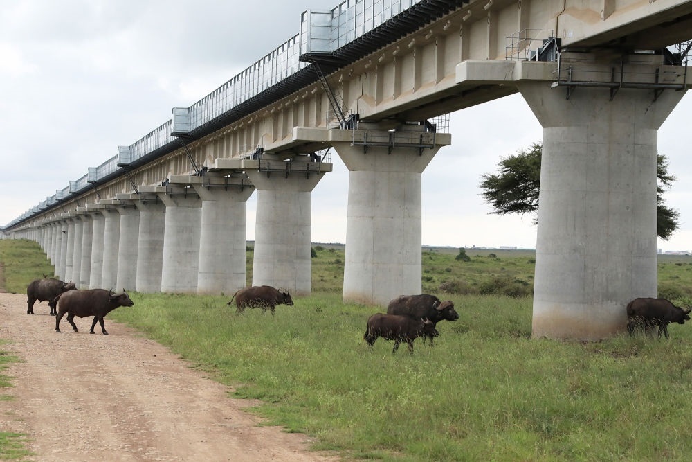 水牛在裝有聲屏障的肯尼亞內(nèi)羅畢國家公園特大橋下穿行(2021年5月19日攝)。中非共建的肯尼亞內(nèi)馬鐵路采用特大橋全程穿越內(nèi)羅畢國家公園方案,橋墩超過6米,讓長頸鹿也能“昂首通過”;特大橋護欄兩側安裝聲屏障,極大降低火車通過時的噪音。