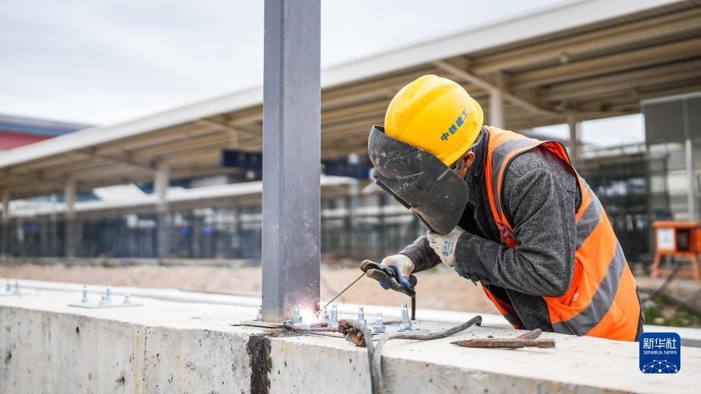 5月1日,中鐵建工集團(tuán)工人在貴州貴安新區(qū)貴安站擴(kuò)建項目工地施工。